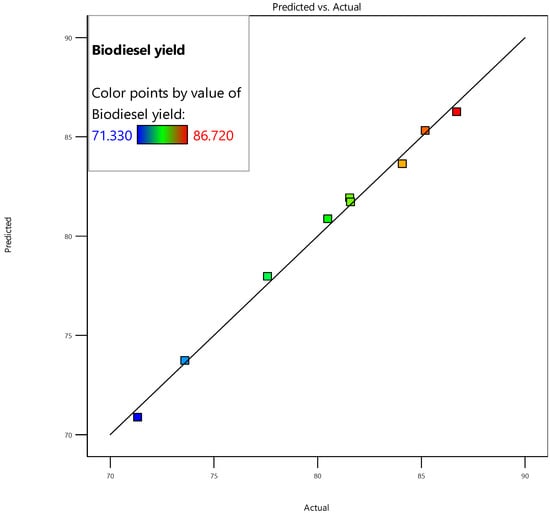 where: is the PKO biodiesel yield, , is the ethanol-to-PKO ratio, is the CHC loading, , is the reaction temperature, (°C), and are the levels of each factor. Based on the studies by Oladipo and Betiku [38] and Olatundun et al. [28], the methanol-to-oil ratio and reaction time, respectively, were excluded from the mathematical model because they were statistically insignificant (). The model’s experimental and predicted values, which assess the model, are shown in Figure 9. The graph shows the correspondence between the two datasets. The approximation points are almost diagonal, thereby showing the accuracy of the model in explaining the process.