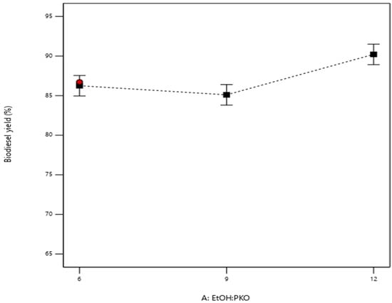 An ANOVA study was used to analyze both the model and individual parameters. The significant parameters influencing the process parameters were determined. For this current investigation of PKO transesterification using the developed CHC, the regression analysis takes into account the significant parameters while discarding the inconsequential ones [37]. In the mathematical model equation (Equation (9)) for predicting PKOEE yield, the coefficients of each significant parameter determined with a 95% () confidence level were considered.