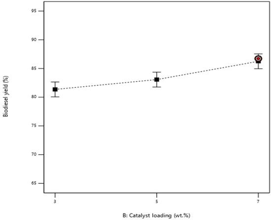 The amount of catalyst in relation to the amount of oil influences the rate of transesterification [33]. To investigate the influence of catalyst loading on PKOEE yield, different catalyst amounts of 3.0, 5.0, and 7.0 wt% were used, while all other process variables remained constant (an ethanol-to-oil ratio of 6:1, reaction temperature of 65 °C, and reaction time of 120 min). Figure 11 depicts the effect of catalytic loading. The figure shows that, as catalyst loading increased from 3% to 7%, the yield of PKO biodiesel increased from 81.35% to 86.72%. The rise in PKOEE yield from low to high catalyst concentrations might be attributed to the CHC’s active catalytic sites, that resulted in a greater PKO conversion yield [38]. Reports on similar studies, as defined by Nath et al. [24] and Olatundun et al. [28], show that soybean and honne oil biodiesel yield, respectively, increased as the concentration of catalyst developed from Brassica nigra plant and cocoa pod husk-plantain peel blend (CCP) increased. This revealed that catalyst loading has a significant effect on biodiesel yield, and this current result corresponds to those reported in similar studies.