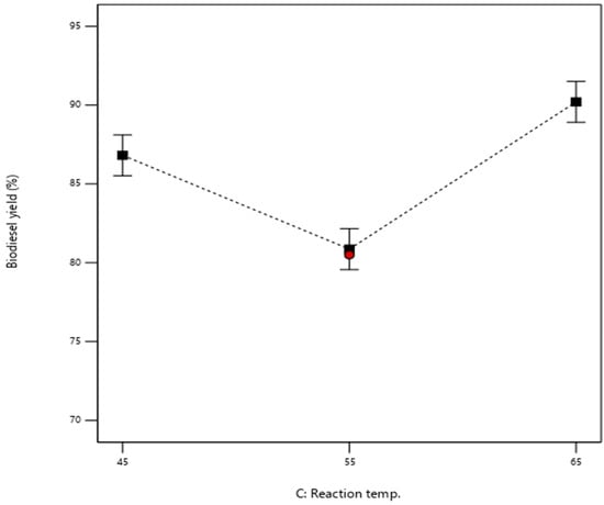 Various factors, such as reaction rate or agitation, catalyst loading, reaction temperature, reaction time, and alcohol-to-oil ratio, affect biodiesel quality and yield. Additionally, the process parameters of catalyst loading, reaction temperature, alcohol-to-oil ratio, and reaction time are of particular importance [35]. It is difficult to predict the appropriate combination of process parameters in routine experiments for optimal biodiesel yield. For example, for an optimization approach like that in this study, surface methodology combined with central composite design or Box–Behnken usually requires more experimentation to determine the optimal parametric conditions for each process [36]. Therefore, a well-organized design with less experimentation can eliminate cumbersome procedures for some combinations [37]. A new method of Design of Experiment (DOE) to consider the effects of different process parameters on the average and variance of performance characteristics that determine the proper functioning of a process has been developed by Dr. G. Taguchi.