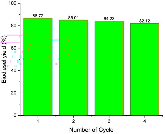 The reusability ability of the CHC was investigated by using the catalyst for four consecutive reaction cycles under the previously determined optimum reaction conditions. For the reusability investigation of CHC, the approach described by Nath et al. [24], Falowo et al. [3], and Oloyede et al. [10] was used. The product mixture and the catalyst were separated by filtration through Whatman filter paper at the end of each transesterification cycle (110 microns). The CHC was reapplied without any additional treatment, such washing or calcination. Figure 13 depicts the biodiesel (PKOEE) yield for the four consecutive cycles. According to the graph, the CHC attained a maximum biodiesel yield of 86.72% in the first run and a yield of 82.12% in the fourth. The decreased activity of the recovered catalyst after each cycle could be attributed to the deactivation of active basic sites as a result of the loss of particular elements, which can reduce the active sites of a catalyst [34]. The results showed that the catalyst had excellent reusability efficiency, possibly attributable to the inclusion of transition metal oxides in the catalyst [54].