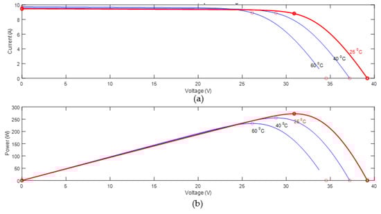 (a) I-V and (b) P-V characteristics of a solar module under varying temperature [,].