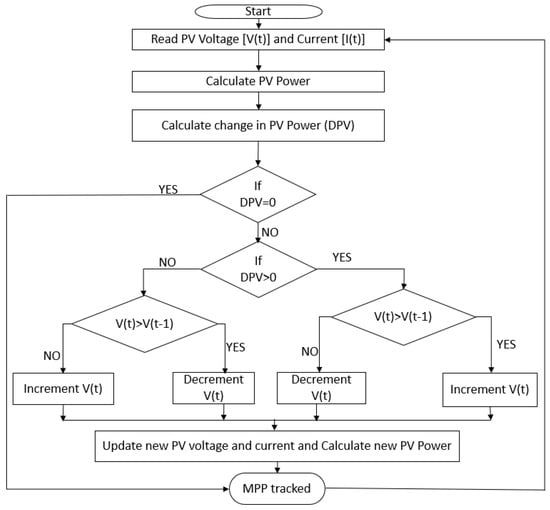 P&O MPPT methods are conventionally implemented and modified with fixed and adaptive step sizes []. Figure 3 shows a flowchart followed by this method.