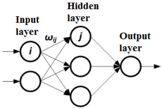 ANN is a soft computing approach inspired by our central nervous system (brain). To create a network similar to a biological neural network, these computer models, which are capable of machine learning, are represented as interconnected neurons (artificial nodes). Connection weights are modified during the training process until the best fit, or the reference voltage corresponding to MPP, is attained [,]. The model has three levels: input, hidden, and output layers, as shown in Figure 5. Atmospheric data such as temperature and irradiance, PV module parameters such as Voc and Isc, or a mix of the two, can be used as input variables. The output represents the duty cycle signal that causes the converter to follow the MPP, according to the hidden layer. The link between nodes I and j is given the weight Wij. In the neural network technique, node-to-node links are weighted based on a training process where PV parameters are assessed and recorded over months or years to obtain the proper weight for each node. The drawback of this approach is that the neural network cannot be generalized to operate on multiple types simultaneously because it must be trained specifically for the PV module being used. Additionally, because the PV panel’s characteristics change over time, the neural network needs to be trained frequently in order to precisely follow the MPP []. To make this technology broadly applicable, more research is required to confirm that an algorithm trained on one PV system can be utilized on another system to track MPP.