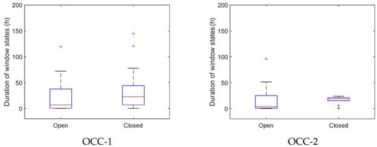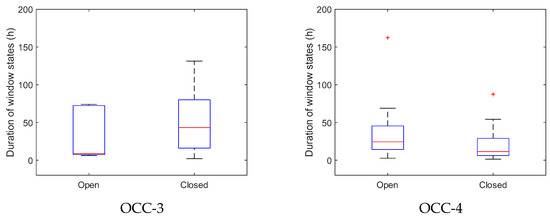 Figure 4 shows that there are huge uncertainties in the duration of window opening and closing. The shortest window opening only lasts dozens of minutes, while the longest window opening duration reaches more than 100 h (about 4–5 days). The longest window opening duration of OCC-3 is more than 350 h, which is equivalent to half a month. The average window opening and closing durations of OCC-1 is 23.9 h and 34.8 h, respectively, the values of OCC-2 is 13.2 h and 14.6 h, respectively, the values of OCC-3 is 68.8 h and 51.4 h, and that of OCC-4 is 37.3 h and 22.0 h, respectively. It can be seen that the opening and closing time of OCC-2 is the shortest—only half a day. This is due to its higher adjustment frequency according to the analysis above. Also, according to the opening and closing time mentioned before, it can be seen that OCC-2 usually opened the window in the morning and closed it in the afternoon. The window opening and closing durations of OCC-3 are the longest, about 4–5 times longer than that of OCC-2. The durations of the other two participants are relatively close, both are within the range of 20–30 h. The main difference between the two is that the window closing time of OCC-1 is longer than that of window opening, whereas the situation of OCC-4 is in contrast.