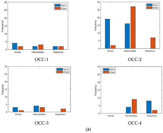 Figure 2a indicates the frequency of window-opening behaviors for the four participants. The measurement duration for OCC-2 is 40 days, whereas that for the other three is around 22 days. In terms of the action frequency, OCC-2 has a higher value than others. The daily average opening frequency for each one was calculated, and the results show that OCC-2 has the highest value of 0.92, followed by OCC-4 (0.54), OCC-1 (0.38) and OCC-3 (0.35). Therefore, they could be divided into three categories as high frequency, mid frequency, and low frequency for window opening. In order to compare the results from the statistical perspective, the daily window opening frequencies were compared by changing the survey durations of all four participants to 40 days, meaning that the frequency for OCC-1