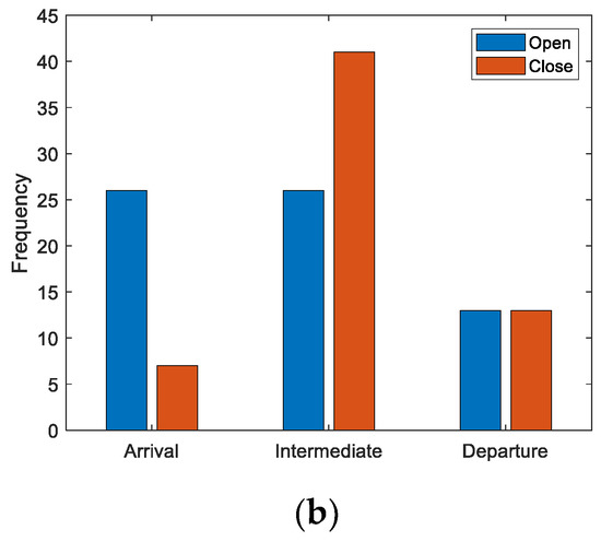 36]. In other words, the window opening behaviors of the four are different from those in other districts—they are not used to opening window when getting to work and closing it when getting off work. In contrast, their ratio of opening or/and closing window in the intermediate time is relatively higher. In addition, the ratio of the total window opening time to the total testing time is basically the same as the ratio of the total window opening time to the room’s occupancy time, indicating that the presence or absence of a person in the room does not have a significant impact on the ratio of the window’s open time to the closed time. This implies that it may not be useful to increase the ratio of window opening to strengthen natural ventilation by increasing the occupancy rate of the room.
