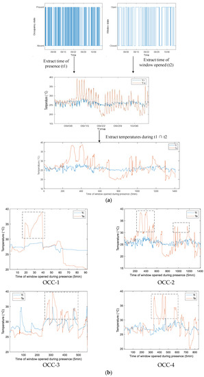 Figure 6a. The duration people stay in the room and that of window opening intersected so that the duration for the window opening when people are in the room can be presented. Next, the outdoor air temperature for this period was obtained. In this study, it is assumed that it is irrational if the window was opened when the outdoor air temperature was above 30 °C, as it would increase the heat gains and the consequent cooling demand.