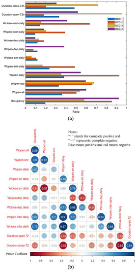 39]. In order to analyze the occupants’ window use behaviors, investigate the interrelationship between behavior features, and further reveal the characteristics of adjustment behaviors, 12 features closely relative to the window opening behaviors were selected. These 12 features include daily average occupancy rate (based on 8 h working hours per day, excluding weekends and holidays), the ratio of total window opening time in the measurement period, the ratio of the total window opening time in the room’s occupancy time, the average daily frequency of window opening, average daily window opening frequency at arrival time, average daily window closing frequency at arrival time, average daily window opening frequency at departure time, average daily window closing frequency at departure time, average daily window opening frequency at intermediate period, average daily window closing frequency at intermediate period, the ratio of the average window opening time to 72 h duration, and the ratio of the average window closing time to 72 h duration. As the average window opening and closing time are in a different scale with other features, the ratio of these two durations to 72 h should be considered here to better show all the features in the same figure. The whole day would be divided into three periods, arrival (within 15 min from the time the first occupant arrived), intermediate and departure (within 15 min from the time the last occupant left), since previous studies have found that the probabilities of window action are higher at arrival time and departure time [