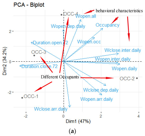Figure 8a presents the distribution of four occupants and 12 variables on the two principal component axes. The “ggplot2 package” is used to visualize the 12 behavior features of different occupants. The first principal component explains 47% of the information in these 12 parameters, whereas the second principal parameter explains 34.2% of the information. It can be concluded that these two principal components explained 81.2% of the information in total, more than 80%, indicating they could explain the information of the original parameters well [