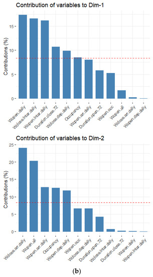 Figure 8b, respectively, variables related to dimension 1(Dim-1) and dimension 2(Dim-2) are represented, and the red dashed line represents the average contribution. It could be figured that the first principal component mainly illustrates Wopen.daily, Wclose.inter.daily, Wopen.inter.daily, Duration.close.72, Wclose.dep.daily, and Occupancy among the 12 variables, whereas the 2nd principal component mainly explains Wclose.arr.daily, Wopen.all, Wopen.arr.daily, and Occupancy, Wopen.dep.daily among these 12 varibales.