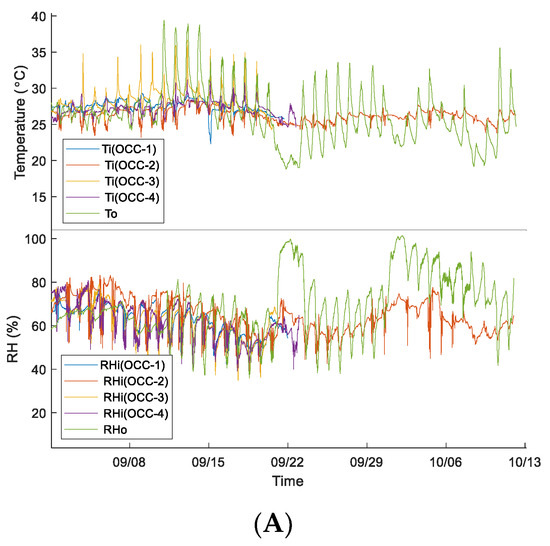 Figure 9A shows the indoor temperature and humidity of the four rooms and the outdoor temperature and relative humidity during the test period. As the monitoring only lasted for 40 days, it lacks the regression data and leads to difficulty in developing a model for each occupant at different times for comparison. Therefore, the data collected were aggregated and dealt with through logistics regression.