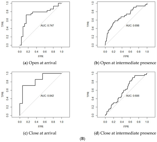 Figure 9B shows the ROC curve and the corresponding AUC of window opening/closing regression model at different time periods. It could be found that the prediction accuracy of the window opening/closing models at the arrival time is relatively high, and the AUC greater than 0.7 means that the prediction accuracy of the regression model is acceptable. However, the prediction accuracy of the model at the intermediate time is relatively low as the corresponding AUC of the model is lower than 0.7. Opening the window when arriving is relevant to the time and indoor temperature. The earlier the occupant arrives at the office and the lower the indoor temperature, the more likely the occupant opens the window. Simultaneously, closing the window when arriving to the office is strongly relative to the time and indoor and outdoor temperature, among which it has the greatest correlation with time. The later the occupant arrives at the office, the more likely the occupant closes the window. Such probability would be increased by a higher indoor temperature. The window opening behavior at intermediate times is only relative to the outdoor relative humidity, whereas the window closing behavior at the same time is relative to the time and indoor temperature.