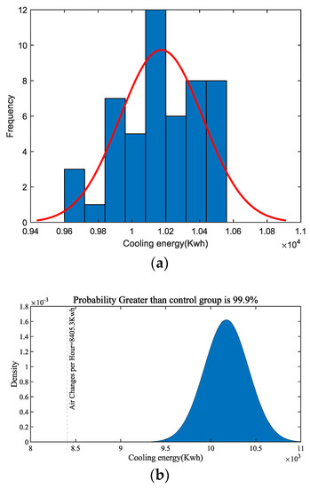 Figure 10a. The mean value of the data is 10,174 kwh, and the upper and lower limits are 10,243 kwh and 10,104 kwh, respectively. The red line is the Gauss Distribution. The data were found to satisfy normal distribution. The control group was ventilated according to the fixed number of air changes, and the cooling energy consumption was fixed at 8405.3 kwh. The probability density curve is shown in