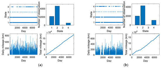 The reliability of a technical object characterises its ability to operate correctly and its resistance to failures and damage [55,56,57]. Within the proposed four-state operational model, an object can switch from states S1–S3 to state S4—provided that it was assigned on a given day with a transport task during the execution of which it experienced damage to at least one of its mechanisms or elements. Mechanical vehicles, as renewable objects, can be characterised through reliability models related to mileage between successive failures [12].