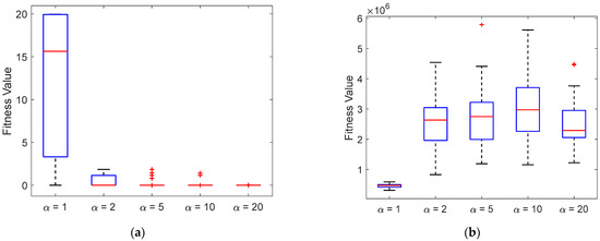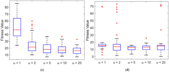 The boxplots for the proposed PSOα for different values of α. (a) Ackley. (b) Fletcher. (c) Rastringin. (d) Rosenbrock.