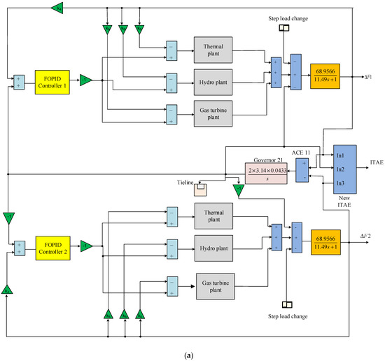 The FOPID controller is proposed for the LFC with the objective to enhance the system performance compared to the traditional PID-based controller. Compared to the PID controller, the FOPID controller has two additional parameters, namely and , other than , and . Here, defines integrator order and defines derivative order, whereas proportional gain, integral gain, and derivative gain are defined by , and , respectively. The block schematic representation of the FOPID controller for the proposed system is represented in Figure 5. The transfer function of the FOPID controller is characterised by Equation (7).