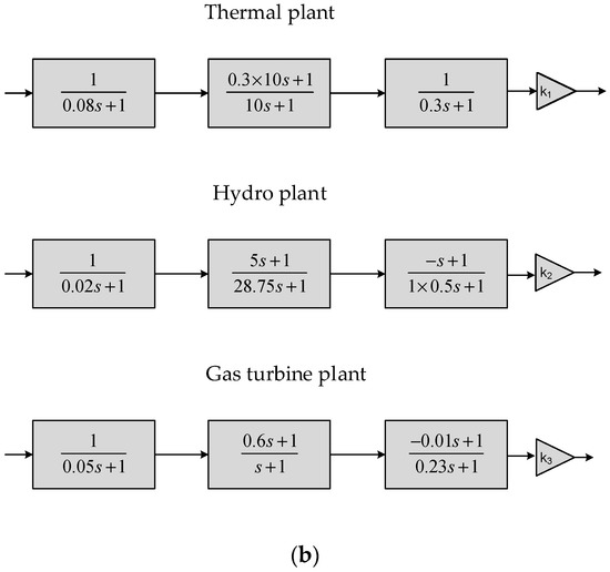 As a test system for LFC analysis using PSOα, a multi-source multi-area power system is considered. Such a test system is shown in Figure 4, which comprises two areas, referred to as area-1 and area-2. The transfer function of the test system is shown in Figure 4a whereas, the transfer function of individual power plants are shown in Figure 4b. Where the different constants used are as follows: , , , , and . Both of these areas are of a multi-source hybrid in nature from the generation’s perspective. Particularly, the thermal plant, hydro plant, and gas turbine plant are considered to infuse the multi-source characteristics in both areas. The frequencies in both the areas, and tie-line power flow between area-1 and area-2 are key parameters of interest.