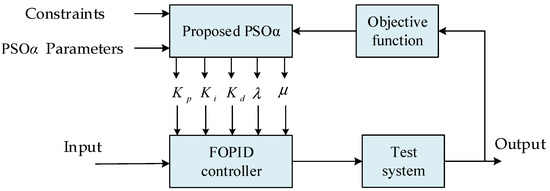 The approach for using the proposed PSOα optimisation techniques for the LFC of the test system is schematically represented in Figure 6. The iterative methodology is used to obtain the performance of the test system with optimised FOPID controller parameters. The parameters of the FOPID controller, i.e.,, , , and , are required to be optimised for the LFC analysis of the test system. For their optimisation, the PSOα optimisation techniques are used for the optimization constraints, and initial values of optimization parameters work as inputs. The inputs to the FOPID controller are frequency variation in the corresponding area, and tie-line power between area-1 and area-2. For the tuning of , , , and , the integral time absolute error (ITAE) is chosen as an objective (fitness) function. The objective function includes the tie-line power and frequency of the proposed test system as defined using (8).