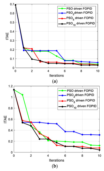 Moreover, the convergence plot for the objective function is compared for both standard PSO, PSO2, PSO5, and PSO10 at different values of the iteration, which is as shown in Figure 9.