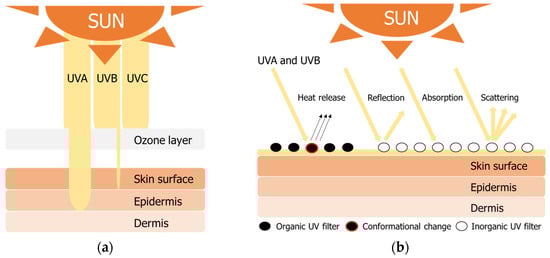 Figure 1. UV radiation properties (a) penetration into human skin and (b) protection mechanisms of organic and inorganic filters.