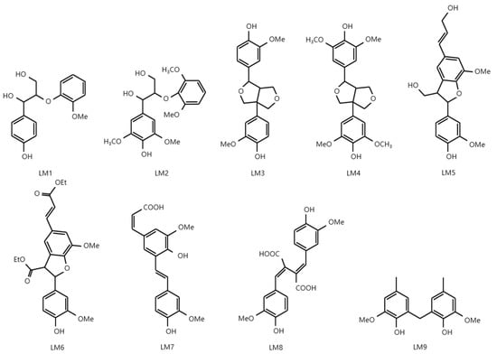 Thermal treatment promotes the demethylation of Kraft lignin by increasing the number of phenolic hydroxyl groups and decreasing aliphatic hydroxyl and methoxyl groups. Widsten et al. converted Kraft lignin into catechol-rich lignin by thermal treatment using softwood and hardwood Kraft black liquor and evaluated its UV transmittance [61]. According to these results, catechol lignin has a better UV-shielding performance than Kraft lignin. This indicates that the phenolic hydroxyl group is more directly related to the UV-shielding performance than the methoxyl group. Phenolic hydroxyl and methoxyl groups are known as major auxochromes and are electron-donating groups. Lin et al. synthesized various lignin model compounds and studied the effect of linkage and functional groups on UV-shielding performance (Figure 2) [62]. The lignin models (LMs) 1–9 contain the typical lignin linkages (β–O–4, β–β, β–5) and various functional groups and structures (phenolic hydroxyl, methoxyl, unsaturated groups, unsaturated groups, and conjugated structures). The results show that the carboxylic acid groups present in the side chain of model lignins are directly involved in improving their SPF. Similar research results were also confirmed by Qian et al.; among five technical lignins, soda, Kraft, sodium lignosulfonate, enzymatic-hydrolyzed lignin, and organosolv lignin with the highest conjugated carbonyl group content had the best UV-absorbing effect [33]. Meanwhile, among the three typical linkages (β–O–4, β–β, and β–5) of lignin, the β–5 linkage showed the highest SPF, considering the structural differences. The UV absorbance is generally increased over the entire UV range (UVA and UVB) as the number of unsaturated groups and conjugated structures is increased.