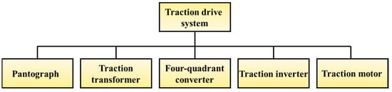 With the fast development of high-speed railways, the heat management problems of the traction drive system for high-speed trains are given increasing attention, leading to a serious operation reliability crisis []. The traction drive system for high-speed trains consists of five parts, namely, pantograph, traction transformer, four-quadrant converter, traction inverter and traction motor, as shown in Figure 1. The pantograph transmits the high voltage to the traction transformer, which reduces the high voltage and then transfers it to the traction converter. The traction converter rectifies, filters, and inverts the input current, and outputs three-phase AC to drive the traction motor to rotate. During this current transmission process the electrical components of traction transformer, traction converter, and traction motor will generate much heat, which will cause the electrical components to experience high temperature and may even cause insulation failure, fire damage and shortening of service life []. The improvement of the current collection quality of the pantograph can improve the working performance of the transformer, converter, and motor, thus having a positive effect on the thermal management of electronic components []. Therefore, the improvement of the aerodynamic characteristics of the pantograph is important to ensure the reliability of train operation and traction drive system.