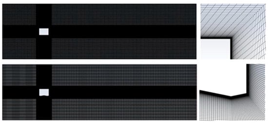 In order to ensure the complete development of the wake vortex behind the bowhead and capture the development of the flow field near the bowhead, as well as to combine the computational resources and computational costs, the flow field range is determined to be 28D × 8D, the bowhead is 5D from the entrance, and the bowhead is 3.5D from the upper and lower flow fields. The meshing is performed using ICEM with an unstructured grid with ≥80,000 grids and y+ ≤ 1. The cross region in the computational domain where the bowhead is located is meshed with encryption []. The details of the rectangular, 3w1h-shaped bowhead boundary layer meshing are shown in Figure 4.