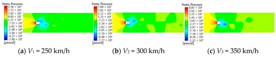 The variation of the air pressure field around the rectangular bowhead at different velocities is shown in Figure 5. The maximum pressure is at the stationary point in front of the bowhead, and the minimum pressure appears at the upper and lower sides of the bowhead. When the speed is 250 km/h, the maximum pressure of the air around the bowhead is about 3590 Pa, and when the speed increases to 350 km/h, the maximum pressure is about doubled to 6830 Pa. When the speed increases, the pressure at the windward side of the bowhead and the stationary point also increases, but the pressure at the low-pressure area at the leeward side of the bowhead gradually decreases. Therefore, the difference between the pressure at the front and rear of the bowhead increases gradually with the increase of speed, and the resulting pressure difference is the main source of pneumatic resistance during the operation of the pantograph.
