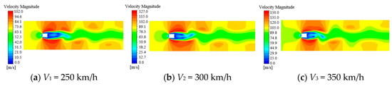 The velocity contour of the rectangular bowhead operating at 250 km/h, 300 km/h and 350 km/h speed conditions are shown in Figure 6. The air separates at the windward side of the bowhead, so that the pressure at the front stationing point is maximum and the speed becomes small. After the air separated by the upper and lower sides the velocity became sharply larger, and a low velocity zone was generated near the bow head, which was due to the formation of two vortices with opposite rotation directions on the upper and lower surfaces, and backflow occurred. The formation of a continuous vortex behind the bow head will increase the loss of mechanical energy. In addition, the maximum velocity of air around the bowhead increases with the increase of velocity.