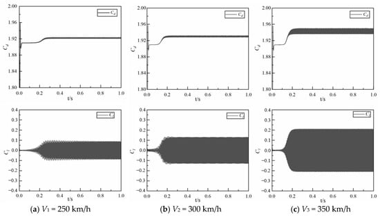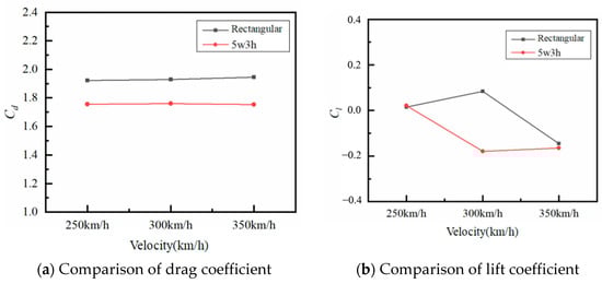 Then, Figure 12 compares the variation of aerodynamic forces with speed for rectangular and 5w3h-shaped bowheads. With the train speed increasing the variation of the drag coefficient is small for both rectangular and 5w3h-shaped bowhead, and the drag force of 5w3h-shaped bowhead is smaller than that of the rectangular bowhead at three train speeds, as shown in Figure 12a. At the three speeds, the drag coefficient is reduced by 8.59%, 8.71%, and 9.77% using the 5w3h-shaped bowhead, respectively. In Figure 12b, the lift coefficient for rectangular bowhead is increased first and then decreases with increase of velocity, and the lift coefficient for 5w3h-shaped bowhead decreases first and then increases with increasing train speed. Moreover, at train speed of 300 km/h the lift force on the 5w3h-shaped bowhead is smaller than that on the rectangular bowhead, and there is a small difference in train speeds of 250 km/h and 350 km/h.