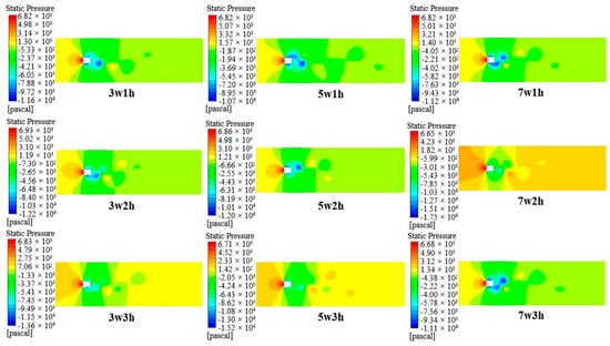 Taking the speed of 350 km/h as an example, the pressure distribution of the flow field of the nine serrated bowheads is shown in Figure 8. The maximum pressure of the three sets of bowheads with 1 mm sawtooth height is about 6820 pa, which is smaller than that of the rectangular bowhead. Compared with the pressure difference of the rectangular bowhead, the pressure difference of 5w1h bowhead is smaller than that of the rectangular bowhead, which is about 17,520 Pa. The difference between 3w1h tooth bowhead and 7w1h bowhead, and rectangular pressure difference is not significant. The low-pressure area of the three groups of bowheads was reduced more obviously after the sawtooth height was increased to 2 mm. The maximum pressure was 6930 Pa, 6860 Pa, and 6650 Pa, respectively, which was larger than that of the rectangular bowhead. The maximum pressure of the three groups of bowheads with 3 mm saw tooth height is about 6830 Pa, 6710 Pa, and 6680 Pa, which are smaller than that of the rectangular bowhead. The minimum pressure is about −13,600 Pa, −15,200 Pa, and −11,100 Pa respectively. The maximum pressure difference is smaller than that of the rectangular bowhead, which is 17,780 Pa.