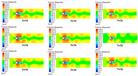 The velocity distribution of the air flow field for the nine serrated bowheads is shown in Figure 9. The tail flow area of the bowhead becomes smaller as the number of teeth increases when the tooth height is 1 mm. Compared with the rectangular bowhead, due to the serrated groove structure on the lower surface, the return phenomenon of air reattachment occurs after the boundary layer separation in the near-wall area of the groove, which eases the turbulent separation and makes the air in the flow field reattach in the groove, effectively reducing the kinetic energy loss.