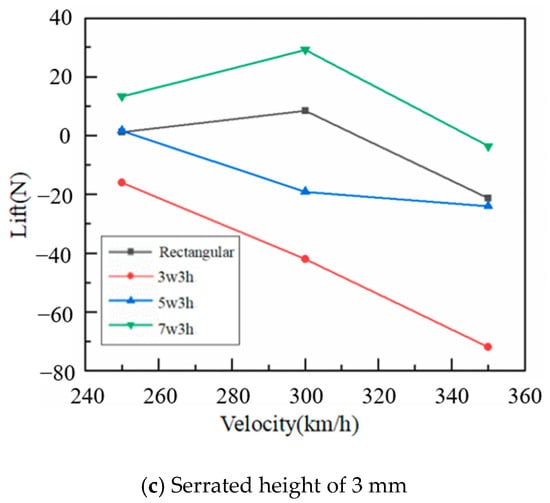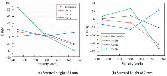 The bowhead lift force plays an important role in the stable operation of the pantograph. Under different operating conditions, the smaller the change of lift force on the bowhead, the higher the quality of the pantograph head and the stronger the resistance to wear. Figure 10 shows the variation curves of lift force with speed for rectangular and serrated pantograph heads. As the speed increases, the lift force of the rectangular head increases slowly and then decreases. Moreover, with the increase of air flow velocity, the variation amplitude of 5w1h, 3w1h, and 5w3h bowheads are smaller than that of other shapes of bowheads. With the increase of the height of the sawtooth for a given sawtooth number, the lift force gradually decreases, which is because the sawtooth structure inhibits the shedding of the tail vortex on the lower surface of the bow head.