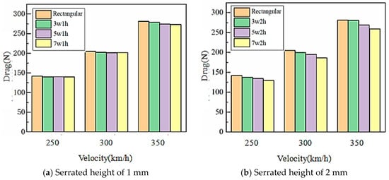 With the increase of wind velocity, the drag forces increase for both rectangular and serrated bowheads. The aerodynamic drag of the bowheads with the serrated structure is smaller than that of the rectangular bowhead, which indicates the better performance on drag reduction effect of the serrated bowhead. In Figure 11, with increasing the sawtooth height the drag force decreases. This is because the air flows through serrated structure and the kinetic energy is partially consumed, which leads to suppression of the shedding of tail vortex. In addition, with an increase of the number of sawteeth, the drag force decreases first for three and five sawteeth and then increases for seven sawteeth.