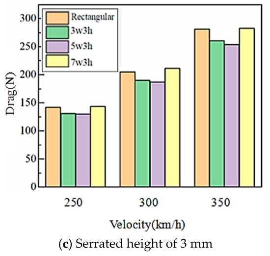 In summary, the 7w2h bowhead has better aerodynamic characteristics, and the resistance is reduced by 8.5%, 8.9%, and 7.9% in the three speeds in Figure 11b, respectively, and the 5w3h bowhead performs best when the saw tooth height is increased to 3 mm in Figure 11c, and its drag is reduced by 8.6%, 8.7%, and 9.9% at the three speeds, respectively. In conclusion, the 5w3h bowhead has the lowest aerodynamic drag among the nine serrated bowheads.