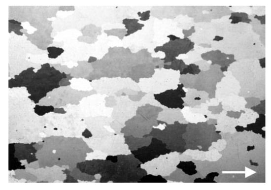 A photograph of the polycrystalline structure of GO steel after removal of isolating coatings. The arrow size on the photo is around 1 cm, whereas its direction depicts the rolling direction. Source: Encyclopedia Magnetica, https://e-magnetica.pl/file/grains_in_go_steel_jpg, author: Stan Zurek, license: CC-BY-4.0 (accessed on 1 November 2022).