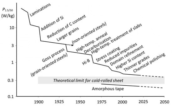 Reduction of specific power density due to improvements in GO processing technology. Source: Encyclopedia Magnetica, https://e-magnetica.pl/file/electrical_steel_progress_magnetica_png. author: Stan Zurek, license: CC-BY-4.0 (accessed on 1 November 2022).