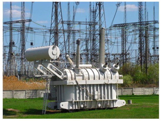 A photo of a high-voltage (750 kV) power transformer. Source: Wikimedia Commons repository, author: Novoklimov, https://commons.wikimedia.org/wiki/ File: High-voltage_transformer_750_kV_ Tpанcфopматop_750_кB.jpg (accessed on 1 November 2022).