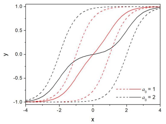 Figure 4 depicts the shapes of simulated hysteresis and anhysteretic curves for two arbitrarily chosen values of . The following can be easily noticed:
