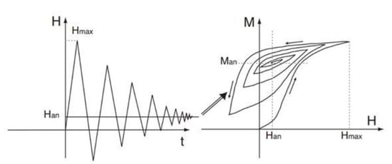 There is a general agreement between scientists that the anhysteretic curve should be related to the description of magnetization process in an ideal material devoid of structural defects or other hindrances to the domain wall movement, referred to as pinning sites [,,]. In reality, such materials do not exist; thus, it might seem that the concept of the anhysteretic curve is vague and unclear. What is even worse, there is an on-going debate between researchers regarding how to reproduce the anhysteretic curve experimentally, cf., [,].