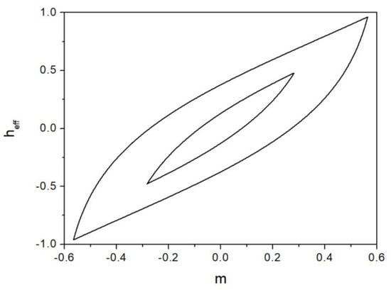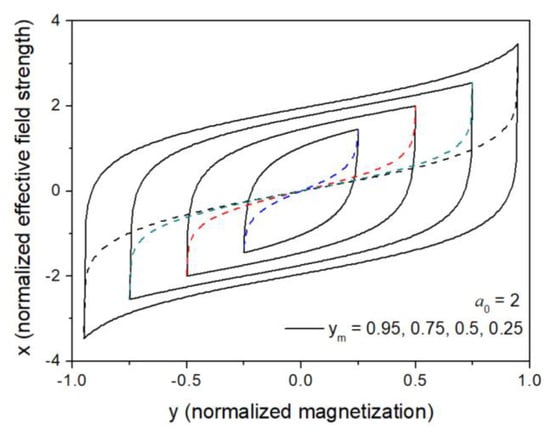 Figure 6 depicts a family of simulated minor hysteresis loops (solid lines) and anhysteretic curves (dashed lines) for the fixed value and for different amplitudes = 0.95, 0.75, 0.5, and 0.25. The interpolated value of coercive field strength for = 0.95 is 1.95; thus, this loop approaching saturation can be considered as the major loop. It can be noticed that the slopes of anhysteretic curves depend on the excitation amplitude: as decreases, the slope y (i.e., the reciprocal of reduced anhysteretic susceptibility) increases for the same .