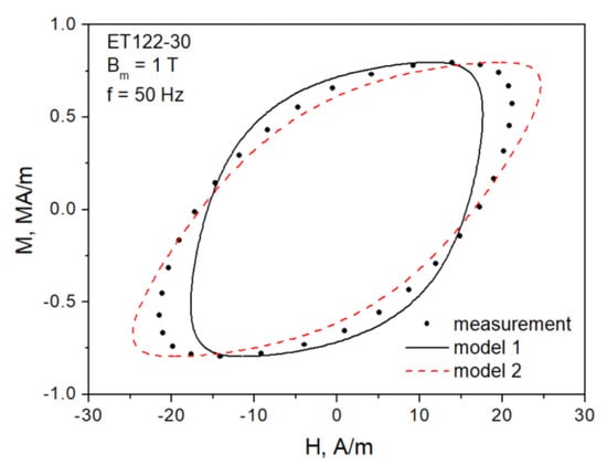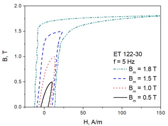 The nominal thickness of grain-oriented steel used in magnetic circuits of power transformers is in the range 0.27–0.35 mm (here we did not take into account the ultra-thin gauges, mentioned in ref. [] and the Introduction section). For model verification we chose a sheet of ET 122-30 grade (0.3 mm thick). Hysteresis loops were measured using a single-sheet tester device and a computer-aided measurement setup, whose fundamental parameters were provided in a recent publication []. The excitation frequency was 5 Hz, which can be considered as approaching a quasi-static (DC) condition, since this value lies well below the threshold value at which dynamic effects begin to play an important role, cf., []. Figure 7 depicts some measured hysteresis loops for the considered grade.