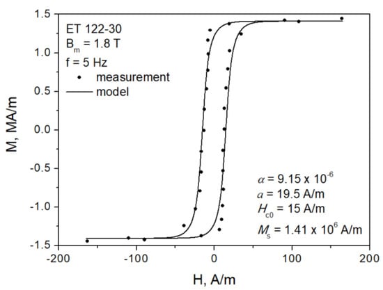 The modeling results for the major loop are depicted in Figure 8. The values of all parameters are also shown in the figure. It can be remarked that the estimated value of the “effective field” coefficient was roughly equal to [,].