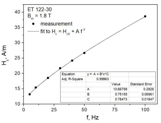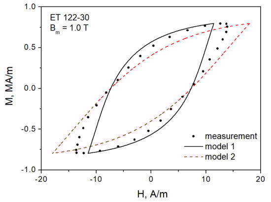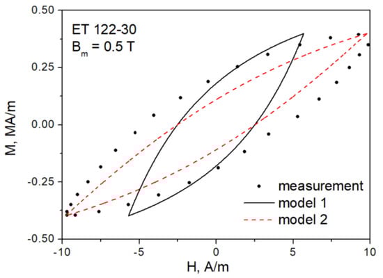 It can be noticed that the T(x) model requires the knowledge of coercive field strength for the major loop. The model parameters are saturation magnetization , A/m, coercive field strength , A/m, the dimensionless Weiss’ coefficient , accounting for mutual interactions between magnetic moments within the material (it appears in the second term of the assumed definition for the effective field ), and the parameter A/m, which basically controls the loop shape. The values of model parameters have to be determined on the basis of magnetic measurements.
