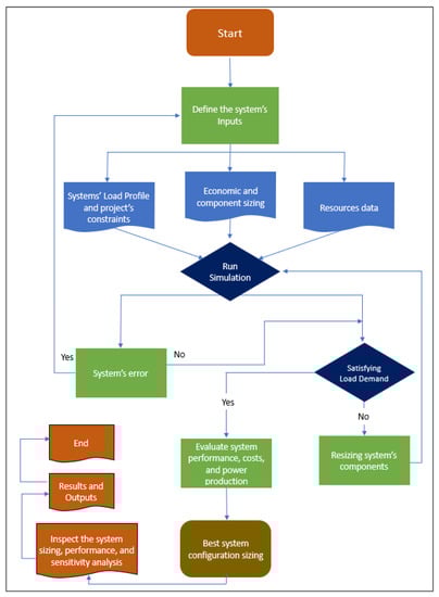 A software program, HOMER Pro, was used to analyze the intended system’s technical and financial viability. The National Renewable Energy Laboratory (NREL) created this program. Numerous studies have been done to determine the RE-based hybrid system’s ideal performance in both off-grid and on-grid modes using HOMER Pro, a significantly acknowledged professional microgrid analysis tool [,,]. Several genuine input elements, including the hybrid system’s component parts and their economic and technical features, local electric or heating load demand, RE data, system economics, limitations, and variable factors, are needed to run the techno-economic analysis using this software. Figure 3 depicts a thorough workflow of this research using the HOMER Pro microgrid analysis program.
