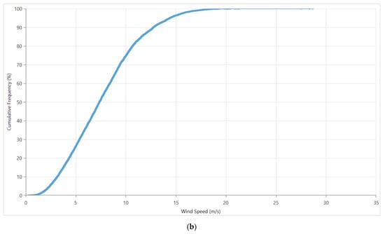 In this paper, hourly wind speed data were used. The real data provided by KACARE, and any of the formats supported by the HOMER software, can be used to import a load, weather data, temperature, or any others from a time-series file. It is necessary to have data that spans 365 consecutive days to use the import function. The scaled annual average of the wind speed data used is around 7.07 m/s. Figure 5a shows the wind speed histogram. As this figure shows, the highest frequency in percentage is seen at speeds of 7 and 8 m/s with an approximate frequency of 10.02% and 10.11%, respectively. The Cumulative Distribution Function (CDF) of wind speed is illustrated in Figure 5b.