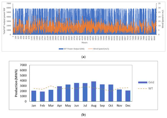 The amount of electricity a turbine produces is primarily influenced by wind speed. Stronger winds produce greater power as they enable the blades to rotate faster. Therefore, faster spinning leads to greater mechanical and electrical power from the generator. Figure 9a shows the relation between wind speed in the selected location and the expected output power from the wind turbines. In this study, 5 wind turbines were considered (1.5 MW each) with a total of around 22% losses factor. Based on the real data collected, the scaled annual average of this site is 7.7 m/s. The wind turbine cut-out and rated speed in this study were 25 m/s and 15 m/s respectively. The results showed that March has the highest wind energy production, with around 2990 MWh, due to the increased wind speed activity during this month. On the other hand, October showed the lowest, with around 191 MWh. The proposed load in this study requires around 177,147 kWh/day and has a peak of 25,144 kW. In the proposed system, the generation sources serve the electrical load as illustrated in Figure 9b. The power output from the wind turbine system, rated at around 7500 kW, is 30,470,320 kWh/y. Also, According to Table 2, a substantial amount of energy generated is surplus and is sold straight to the grid, causing the COE to drop. In addition, nearly half of the power supplied to the load comes from renewable sources, significantly reducing environmental impact, utility bills, and increasing savings.