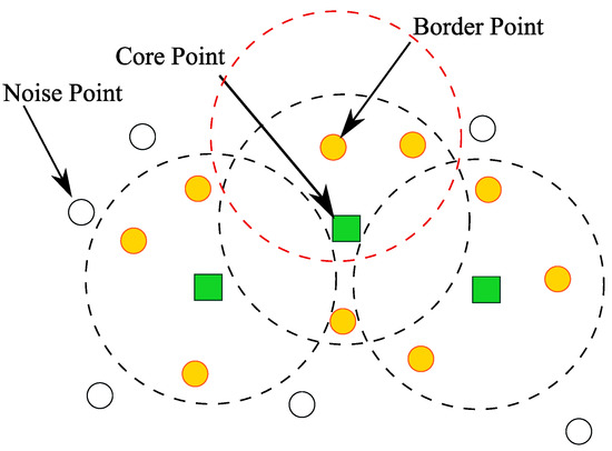 The advantages of DBSCAN are that, unlike the k-means method, it is not necessary to provide a pioneering k number of clusters and that it can determine the noise. DBSCAN does not require the number of clusters k, but it does require the constant parameters and MinPts. The detailed method of DBSCAN is shown below, and an image of DBSCAN is shown in Figure 1.
