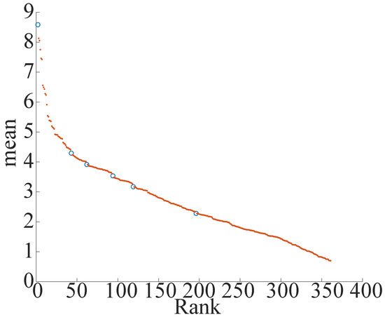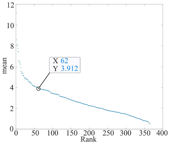 - From the graph, divide the elements into fixed intervals (10 equal parts in this paper) and find the average value of the gradient of the elements within the interval. The average slope for ranks 37–72 in Figure 5 is 0.0213.